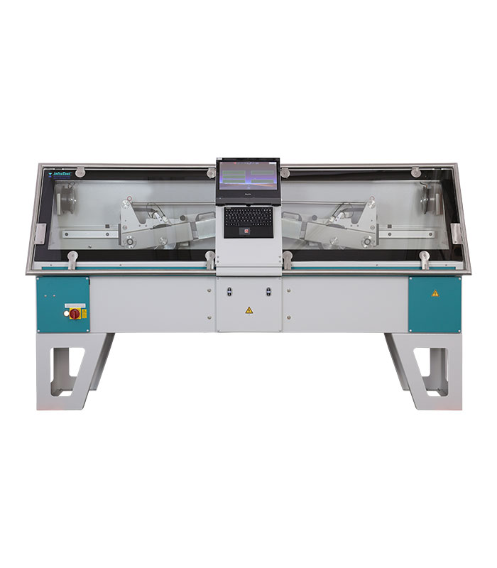 德國 infraTest 的瀝青車轍試驗機(jī)滿足歐盟標(biāo)準(zhǔn)(EN12697-22)和美國規(guī)范 (AASHTO T324-04),小輪兼?zhèn)淇諝鉄?水 浸實驗環(huán)境。瀝青車轍試驗機(jī)由一個獨立的鋼制機(jī)殼組成,機(jī)殼上蓋鑲有可視玻璃窗。兩處檢測點置有低噪音滾輪裝置,由連接曲軸的 頻率控制馬達(dá)驅(qū)動。